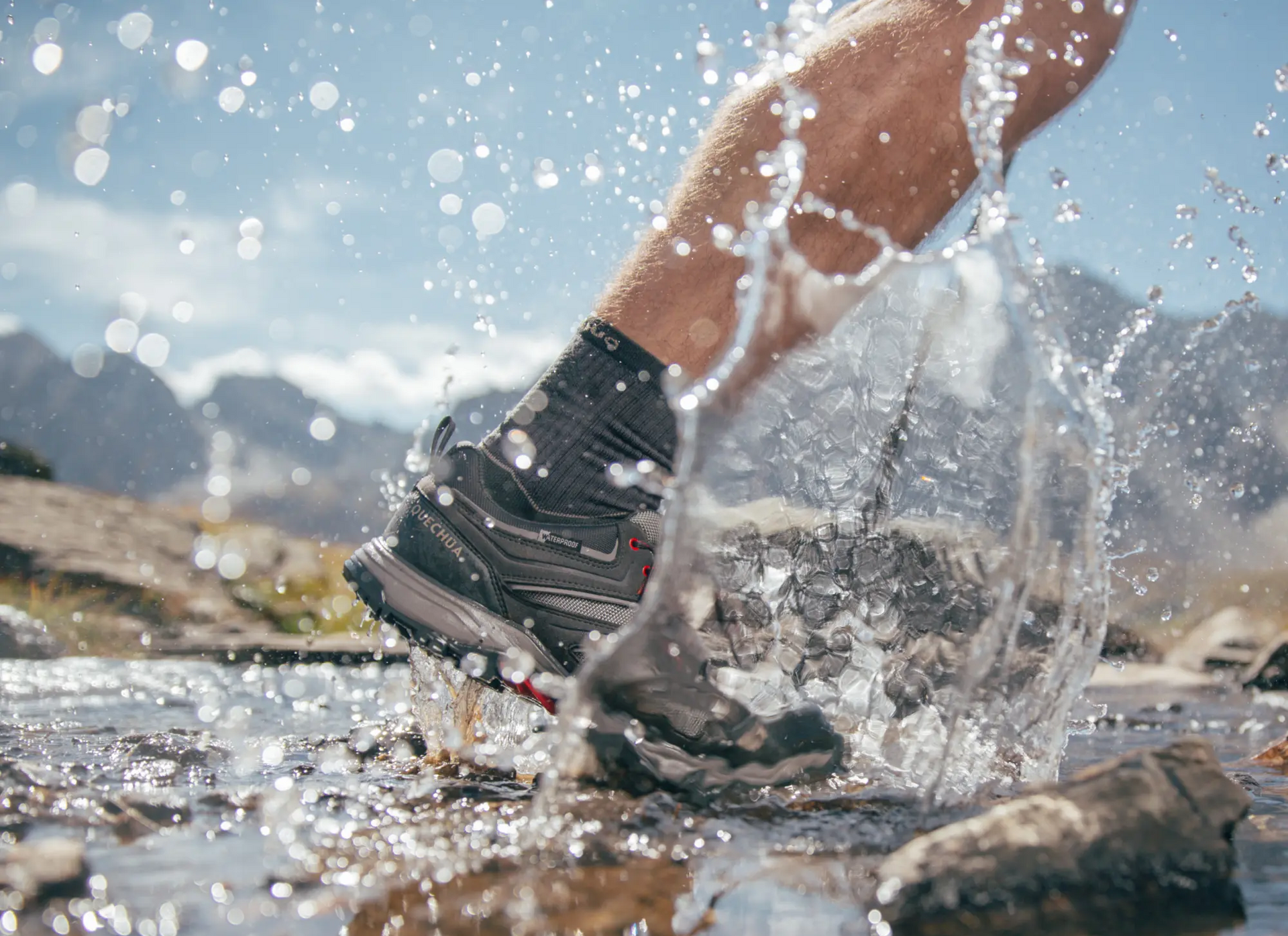 Dans le laboratoire QUECHUA, la chaussure est immergée dans l’eau jusqu’à mi-hauteur sur un bras mécanique qui fléchit pour simuler la marche. Cela peut déterminer le temps et le nombre de kilomètres pendant lesquels la chaussure peut rester sèche. Nous testons ensuite la chaussure sur le terrain dans différentes conditions.