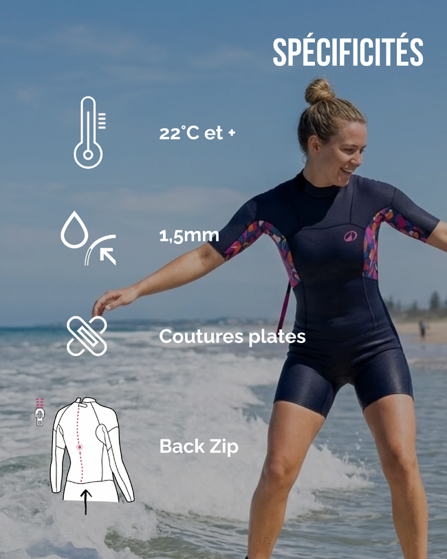 Shorty surf back zip manches courtes néoprène 1,5mm femme, 500 Pétales